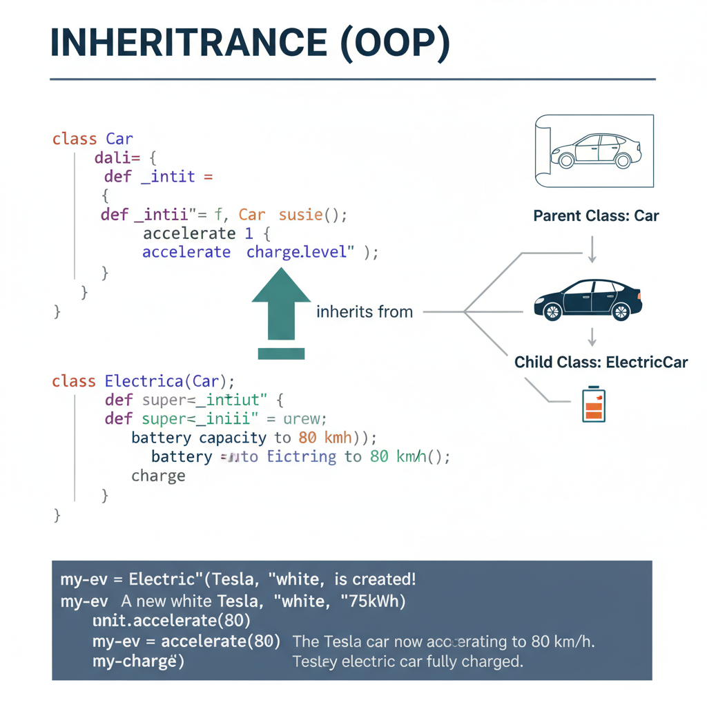 class ElectricCar(Car): # ElectricCar继承自Car def __init__(self, brand, color, battery_capacity, speed=0): super().__init__(brand, color, speed) # 调用父类的构造函数 self.battery_capacity = battery_capacity self.charge_level = 100 def charge(self): self.charge_level = 100 print(f"The {self.brand} electric car is fully charged.") my_ev = ElectricCar("Tesla", "white", "75kWh") my_ev.accelerate(80) # 继承了Car类的accelerate方法 my_ev.charge() # ElectricCar自己的方法