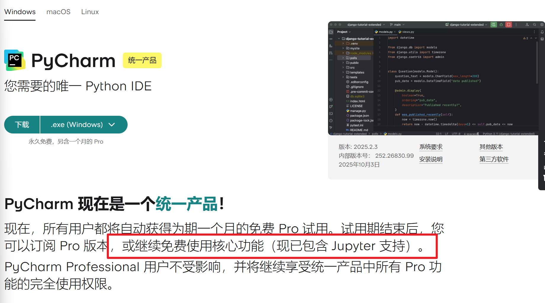 下载 PyCharm:JetBrains 出品的用于数据科学和 Web 开发的 Python IDE: https://www.jetbrains.com/zh-cn/pycharm/download/?section=windows[3]