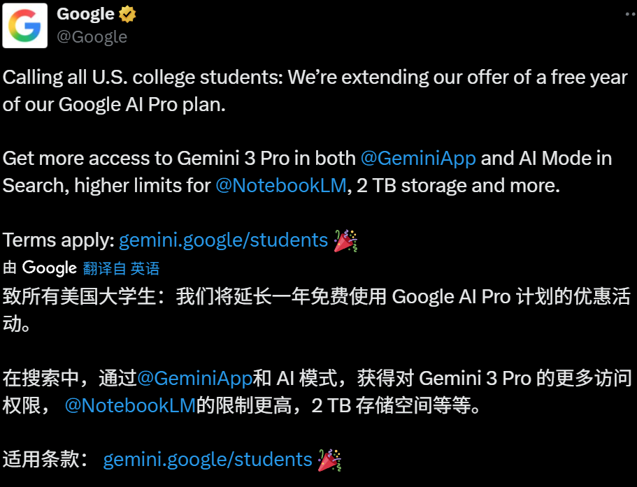 恭喜在座的各位学生:大学生将延长一年免费使用 Google AI 。GeminiApp 和 AI 模式,获得Gemini 3的更多访问权限,NotebookLM可用2TB存储空间等等。