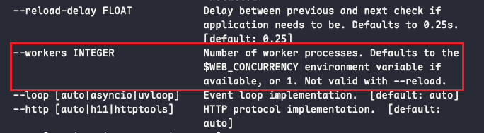 在官方文档里reload和worked多核CPU是互斥参数,如果使用热重载,则多核CPU执行python代码会失效,因此在开发环境可配置reload,在生产环境则去掉reload。
