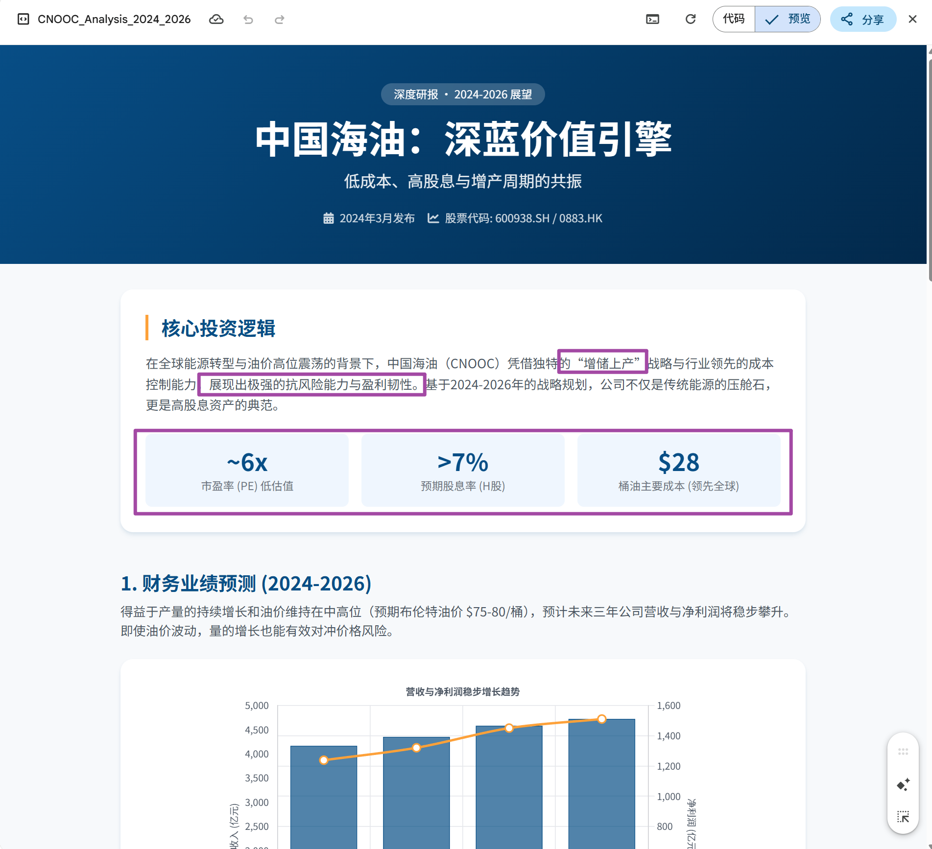 朋友们,AI现在已经占据大量投资和工作岗位,今天,我想尝试让AI生成上市公司的财务报告,看AI有没有能力帮助我们完成投资理财分析?大家说有可能吗!YES,让我们以中国海油为例,看看AI能否替代人类,进行深度投资思考