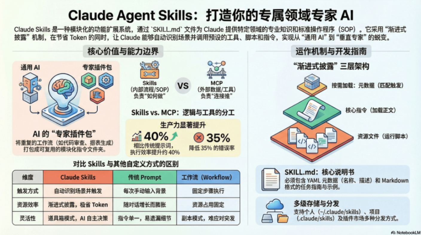 核心定义:Claude Skills 是一个包含指令、脚本和资源的模块化文件夹,通过动态加载机制(Dynamic Loading)实现专业任务的标准化执行,是解耦 AI 逻辑与上下文的核心工程手段。